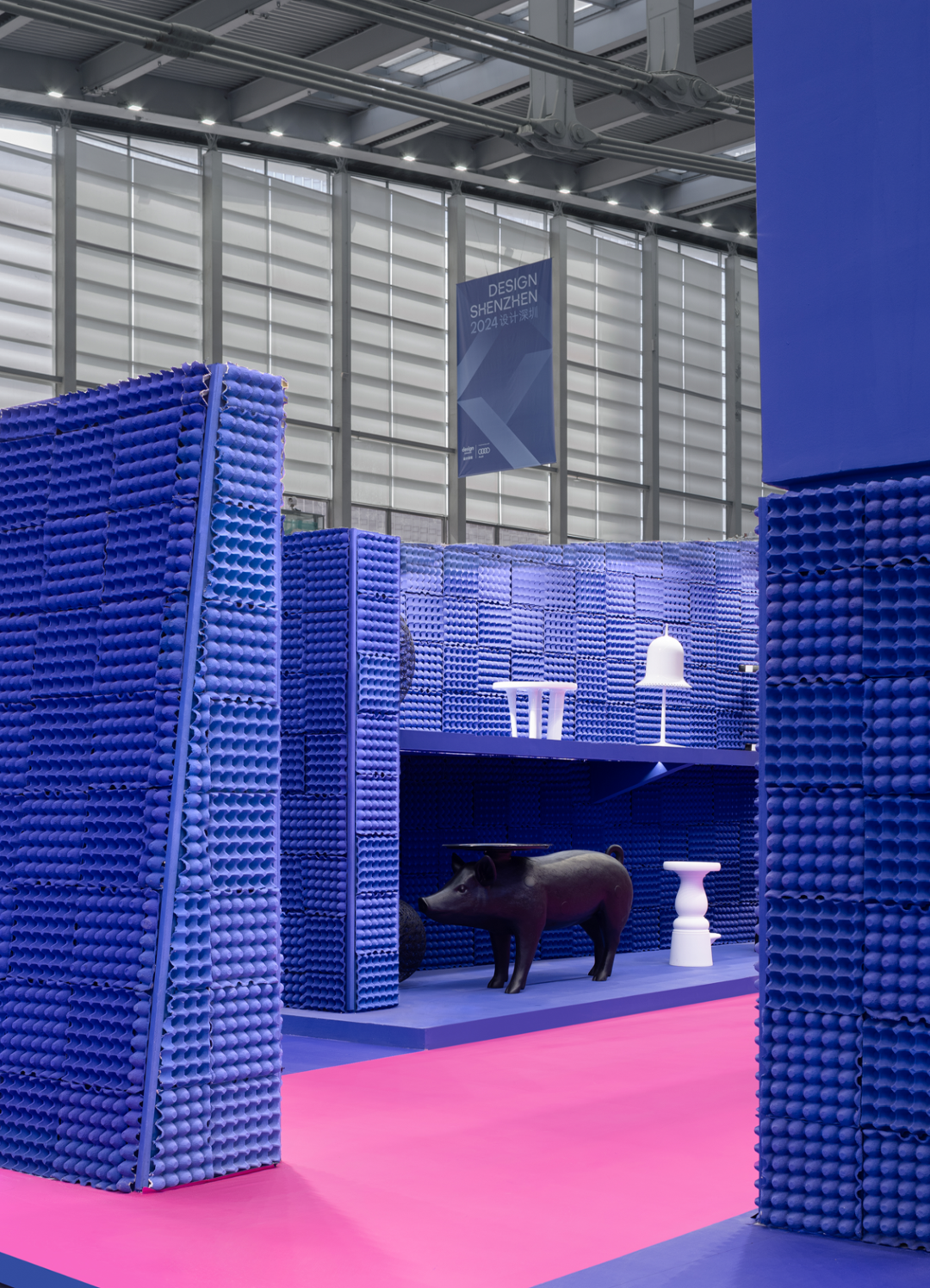 蓝、粉、黑3个不同体块构成的展区中,沿“天桥”依次排布,展示着来自泡泡艺廊、moooi、CASA BRAVA 意美家、瑞士LAUFEN 3个不同品牌的艺术化产品。为观者展现日常生活中使用的器具,亦可拥有艺术质感。