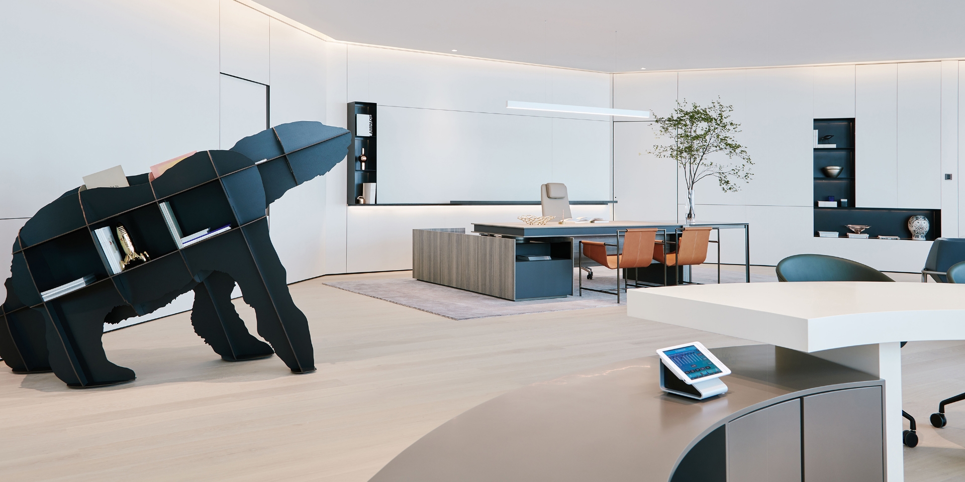 作为一个年轻的而极具爆发力的品牌,需要一个宽阔的容度来容纳其庞大的运营数据。为此,异开设计将“高效、舒适、利于思考”列为空间的核心DNA,用一种凝练简洁、大气流畅的氛围来探寻未来科技企业CEO的办公新模式。
